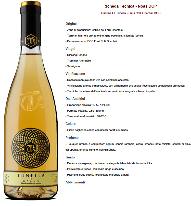 “Noans” è un vino passito di grande carattere, prodotto dalla storica Cantina Tunella, situata nei Colli Orientali del Friuli (Ipplis, Udine). Nasce da un blend elegante e aromatico composto da Riesling Renano, Traminer Aromatico e Sauvignon , tre vitigni che esprimono al meglio le potenzialità del terreno friuliano. Giallo paglierino intenso con riflessi dorati, luminoso ed elegante, bouquet complesso e raffinato, con note di agrumi canditi, miele, e una delicata dolcezza minerale, al gusto è pieno e avvolgente, un equilibrio tra dolcezza e freschezza grazie a una buona acidità. Si percepiscono sentori di arancia candita, limone, albicocca in sciroppo, con una persistenza elegante e una chiusura asciutta.
