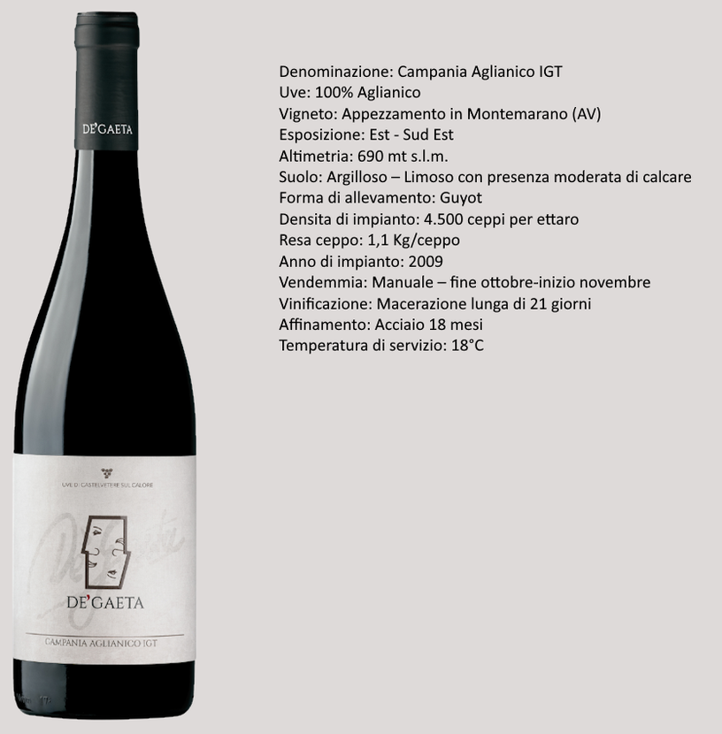 L' Aglianico della cantina De Gaeta nasce a Montemarano, nel cuore dell'Irpinia, un territorio dove l'Aglianico trova una delle sue espressioni più autentiche. Le uve, selezionate esclusivamente da vigneti situati a 690 metri di altitudine con esposizione est–sud-est, affondano le radici in un suolo argilloso e limoso con una presenza moderata di calcare, un ambiente ideale per ottenere vini di grande struttura e longevità. Il vigneto, impiantato nel 2009 e allevato a Guyot con una densità di 4.500 ceppi per ettaro, offre rese contenute di circa 1,1 kg per pianta, garanzia di concentrazione e qualità. La vendemmia, rigorosamente manuale, si svolge tra fine ottobre e inizio novembre, quando i grappoli raggiungono la maturazione perfetta. La vinificazione prevede una lunga macerazione di 21 giorni, che permette di estrarre colore, aromi e tannini in modo armonioso. Il vino matura poi per 18 mesi in acciaio, un affinamento che preserva la purezza del frutto e l'identità varietale dell'Aglianico. Nel calice si presenta come un rosso di carattere, figlio di un territorio vocato e di una lavorazione attenta. La temperatura di servizio ideale è 18°C, per apprezzarne appieno la complessità e la profondità.