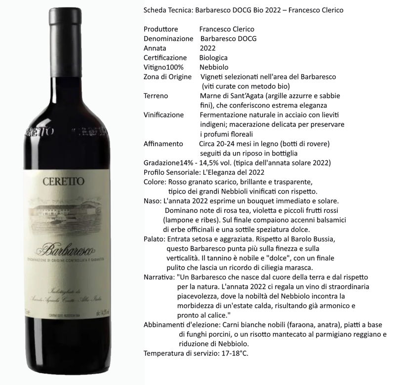 Un Barbaresco elegante, complesso nella sua misura e impeccabile nella sua classicità, perfetto per chi cerca un'interpretazione raffinata e autentica del Nebbiolo.