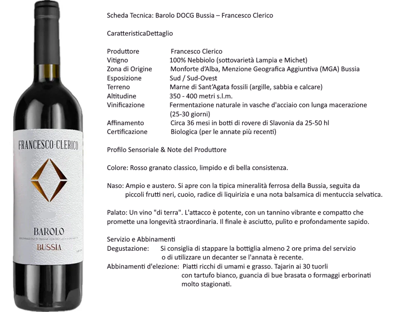 • La Narrazione: Immaginate una camminata nel bosco all’alba: note balsamiche di eucalipto, piccoli frutti rossi appena colti e una freschezza floreale che danza nel palato. La versione 2022 di Bussìa Soprana è una carezza vellutata; meno impetuosa del Barolo, ma capace di una finezza che resta impressa nella memoria come un profumo d'infanzia.