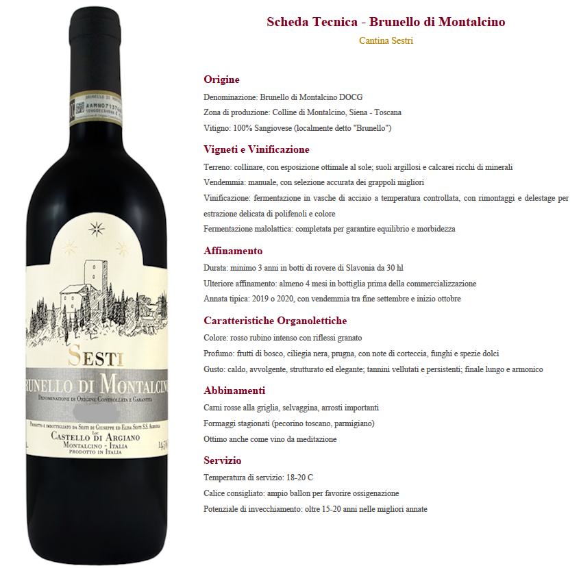 ventilato e di suoli ricchi di galestro e marne calcaree, elementi che contribuiscono a una maturazione equilibrata e ricca di finezza aromatica. Vinificato con metodi tradizionali e affinato per circa quattro anni in grandi botti di rovere di Slavonia, il Brunello Sesti esprime un profilo armonico: