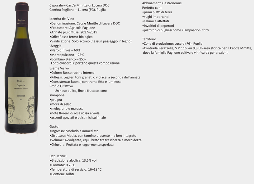 Il Caporale presenta un colore rosso rubino intenso con leggeri riflessi granati. Al naso è delicato, pulito e fruttato con sentori di lampone, prugna, mora e un finale speziato. In bocca è fresco, nonostante la sua nota alcolica, mediamente fruttato e di facile beva.  La Doc Cacc'e Mmitte è stata riconosciuta nel 1975; la zona di produzione comprende i Comuni di Lucera, Biccari e Troia. Il nome dialettale si rifà al tradizionale metodo di vinificazione.  Le vasche per pigiare l'uva venivano affittate, un affittuario toglieva il mosto appena prodotto dalle vasche del palmento “Cacc” per portarlo nelle proprie cantine, e un nuovo affittuario versava nelle vasche “Mmitte” le proprie uve da pigiare.  I vini Paglione nascono da una selezione accurata delle uve a cui segue una delicata diraspapigiatura con vinificazione in rosso classica a temperatura controllata. Durante la fase fermentativa, il mosto è sottoposto a processi di rimontaggio e follatura che garantiscono l'estrazione voluta dei costituenti presenti nelle bucce. La fermentazione avviene in maniera spontanea, ovvero senza l'aggiunta di lieviti selezionati. Il prodotto ottenuto viene successivamente fatto affinare e non è sottoposto ad alcun trattamento di chiarifica e di filtrazione preimbottigliamento.