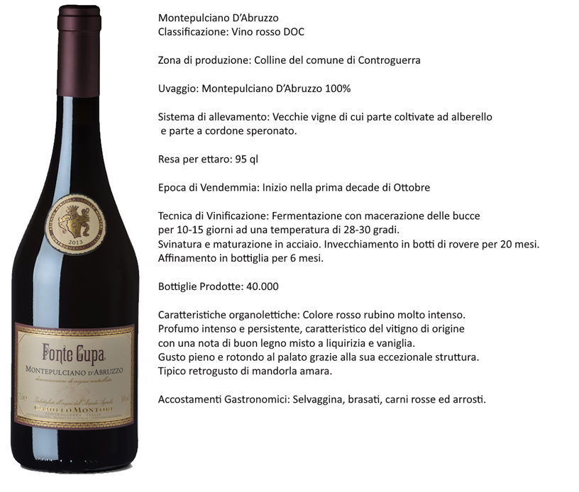 Il Montepulciano d'Abruzzo  della cantina Camillo Montori nasce sulle colline di Controguerra, un territorio vocato alla viticoltura dove il Montepulciano esprime tutta la sua identità. È un vino rosso DOC ottenuto esclusivamente da uve Montepulciano, provenienti da vecchie vigne coltivate parte ad alberello e parte a cordone speronato, un patrimonio agricolo che conferisce al vino profondità e carattere. La vendemmia avviene nei primi giorni di ottobre, quando le uve raggiungono la piena maturazione. La vinificazione prevede una fermentazione con macerazione delle bucce per 10–15 giorni a temperatura controllata, seguita da una maturazione in acciaio. Il vino prosegue poi il suo percorso in botti di rovere per venti mesi, prima di un ulteriore affinamento in bottiglia di sei mesi. Nel calice si presenta con un rosso rubino intenso. Al naso offre un profumo ricco e persistente, tipico del vitigno, arricchito da note di legno ben integrato, liquirizia e vaniglia. Al palato è pieno, rotondo, sostenuto da una struttura importante e da un elegante retrogusto di mandorla amara, firma distintiva del Montepulciano d'Abruzzo. È il compagno ideale per piatti di grande personalità: selvaggina, brasati, carni rosse e arrosti trovano in questo vino un alleato capace di esaltarne i sapori.