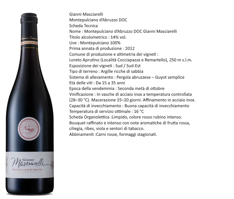 Il Montepulciano d'Abruzzo Masciarelli nasce dal desiderio di raccontare l'anima più autentica dell'Abruzzo, una terra dove la forza della natura incontra la delicatezza del lavoro umano. È un vino che porta con sé la visione di Gianni Masciarelli, il suo impegno nel valorizzare un vitigno capace di esprimere profondità, eleganza e carattere come pochi altri. Le montagne che proteggono il silenzio, un paesaggio che regala alle uve un equilibrio perfetto tra luce, vento e mineralità. Qui il Montepulciano matura lentamente, accumulando colore, struttura e una ricchezza aromatica che diventa la firma inconfondibile di questo vino. Nel calice si presenta con un rosso intenso e brillante, preludio a profumi di amarena, frutti rossi maturi, viole, spezie e leggere note di cacao. Il sorso è pieno, armonico, avvolgente, sostenuto da tannini morbidi e da una freschezza che dona slancio e profondità. È un vino che parla con sincerità, capace di essere al tempo stesso vigoroso e raffinato, immediato e complesso. Ogni bottiglia racconta una storia di dedizione, di rispetto per la terra e di continua ricerca della qualità, una storia che Masciarelli porta avanti da generazioni con passione e visione.