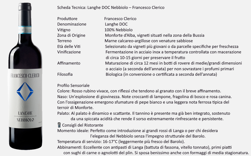 Un Nebbiolo essenziale, autentico e di grande bevibilità, che unisce immediatezza e finezza, perfetto per chi desidera conoscere l'eleganza del vitigno in una versione agile ma impeccabilmente curata.