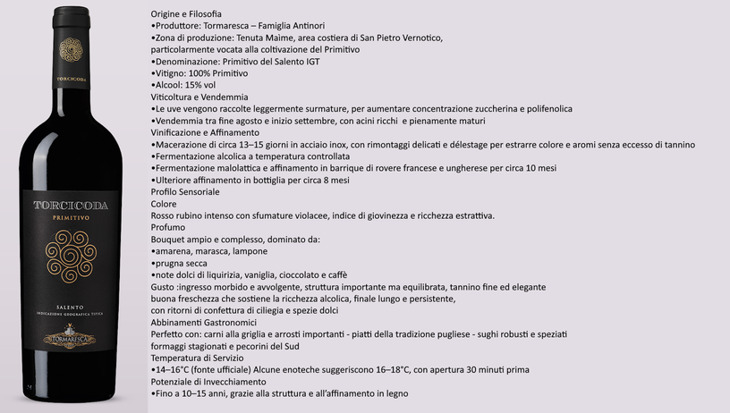 Il Torcicoda è un Primitivo in purezza che interpreta con finezza e intensità l'anima più profonda del Salento. Si presenta con un colore rosso rubino fitto e luminoso, attraversato da riflessi violacei che ne rivelano la ricchezza estrattiva. Al naso sprigiona un bouquet ampio e avvolgente, dove le note di amarena, lampone e prugna maturazione si intrecciano a sentori dolci di liquirizia, vaniglia, cioccolato e caffè, frutto di un affinamento sapiente in barrique. Al palato è morbido, caldo e vellutato, sostenuto da una struttura importante ma perfettamente equilibrata da tannini fini e da una freschezza che dona slancio e armonia. Il finale è lungo, persistente e ricco di richiami alla confettura di ciliegia e alle spezie dolci. Un vino di grande personalità, ideale in abbinamento a piatti della tradizione pugliese, carni arrosto e preparazioni dal gusto deciso. Servire a 14–16°C.