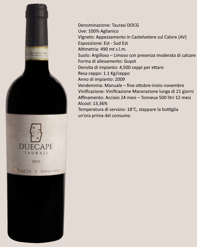 Il Taurasi DOCG della cantina De Gaeta nasce a Castelvetere sul Calore, nel cuore dell'Irpinia, un territorio che da secoli esalta la forza e l'eleganza dell'Aglianico. Le uve provengono da un singolo appezzamento esposto a est–sud-est, situato a 490 metri di altitudine, dove il clima fresco e il suolo argilloso-limoso con moderato calcare permettono al vitigno di maturare lentamente, sviluppando complessità e profondità.  Il vigneto, impiantato nel 2009 e allevato a Guyot con una densità di 4.500 ceppi per ettaro, offre rese contenute di circa 1,1 kg per pianta, una scelta che privilegia la qualità e la concentrazione del frutto. La vendemmia, rigorosamente manuale, si svolge tra fine ottobre e inizio novembre, quando gli acini raggiungono la perfetta maturazione fenolica.  La vinificazione prevede una lunga macerazione di 21 giorni, che consente di estrarre colore, aromi e tannini in modo armonioso. Il vino affronta poi un affinamento di grande respiro: 24 mesi in acciaio per preservare la purezza varietale, seguiti da 12 mesi in tonneaux da 500 litri che ne arricchiscono la struttura e ne arrotondano il profilo. Il risultato è un Taurasi di notevole equilibrio, con un tenore alcolico di 13,36% e una personalità che riflette fedelmente il territorio.  Servito a 18°C, dopo aver lasciato respirare la bottiglia per un'ora, il “Duecape” esprime tutta la sua complessità: un rosso profondo, intenso, capace di coniugare potenza e finezza, tradizione e modernità.