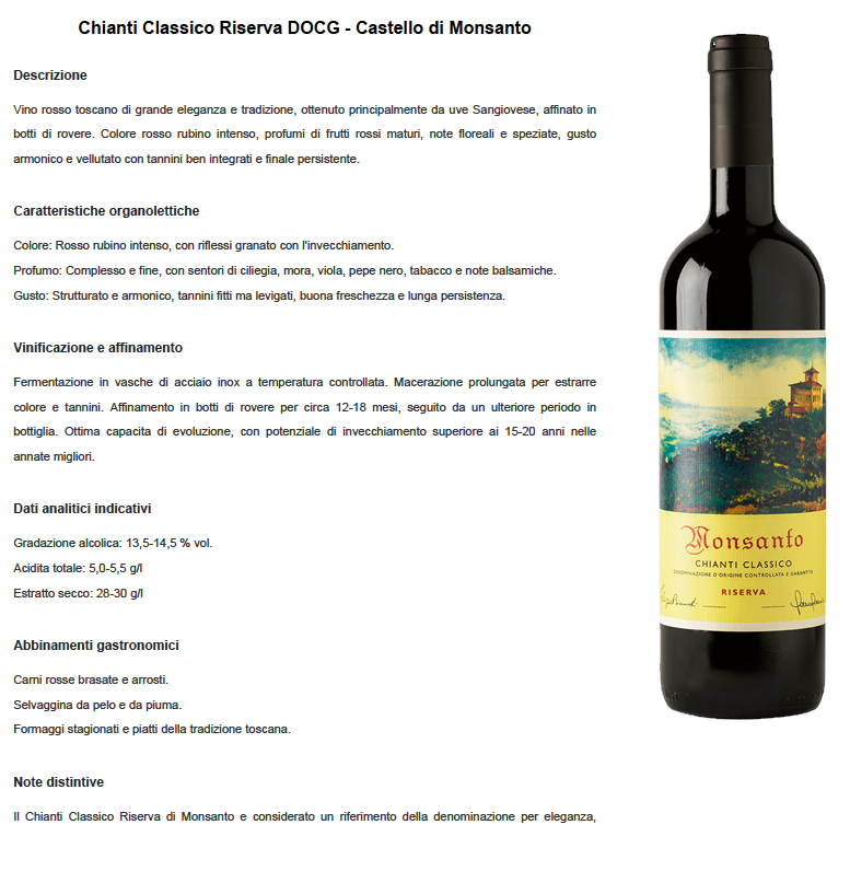Il Chianti Classico Riserva DOCG di Castello di Monsanto è un vino che rappresenta una delle espressioni più autentiche e raffinate del Sangiovese toscano, nato da vigneti storici situati sulle colline del Chianti Classico. Alla vista si presenta con un colore rosso rubino intenso, che con l'invecchiamento tende verso tonalità granato. Al naso offre un bouquet complesso e avvolgente: frutti rossi maturi, ciliegia e mora, si intrecciano con note floreali di viola e sfumature speziate di pepe nero, cuoio e tabacco, arricchite da eleganti sentori balsamici e di legno nobile.