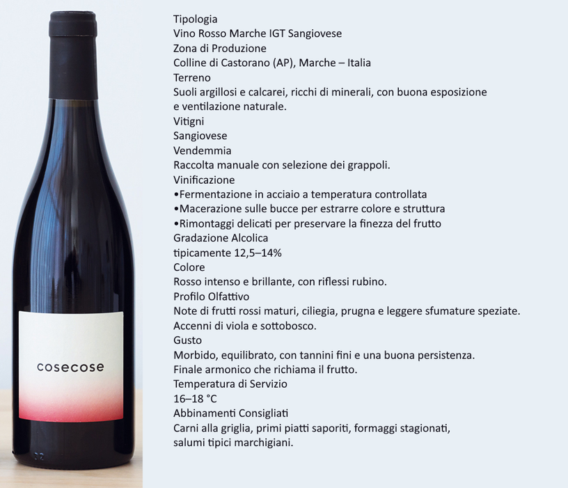 “Cose Cose” nasce sulle colline di Castorano, dove la vite affonda le radici in un territorio generoso e ricco di storia. È un rosso che non vuole stupire con artifici, ma conquistare con autenticità: un vino che parla la lingua della terra, del tempo e della cura artigianale. Le vigne della Cantina Mattoni si estendono su suoli argillosi e calcarei, modellati dal vento e dal sole del Piceno. Le escursioni termiche e la brezza dell'Adriatico donano alle uve una maturazione equilibrata, capace di esprimere freschezza, struttura e profondità aromatica. Cose Cose è il risultato di una vinificazione rispettosa, che privilegia interventi minimi e valorizza la purezza del frutto. Ogni scelta, dalla selezione dei grappoli all'affinamento, è guidata dall'obiettivo di preservare l'identità del vitigno e del territorio. Un rosso dal colore intenso e brillante. Al naso emergono note di frutti rossi maturi, ciliegia croccante e leggere sfumature speziate. Al palato è morbido, equilibrato, con una trama tannica fine e un finale persistente che invita al sorso successivo. Un vino versatile, capace di accompagnare sia la convivialità quotidiana sia i momenti più speciali. Cose Cose si esprime al meglio con piatti della tradizione marchigiana, carni alla griglia, formaggi stagionati e primi saporiti. La sua eleganza naturale lo rende perfetto anche da solo, come vino da meditazione leggera.
