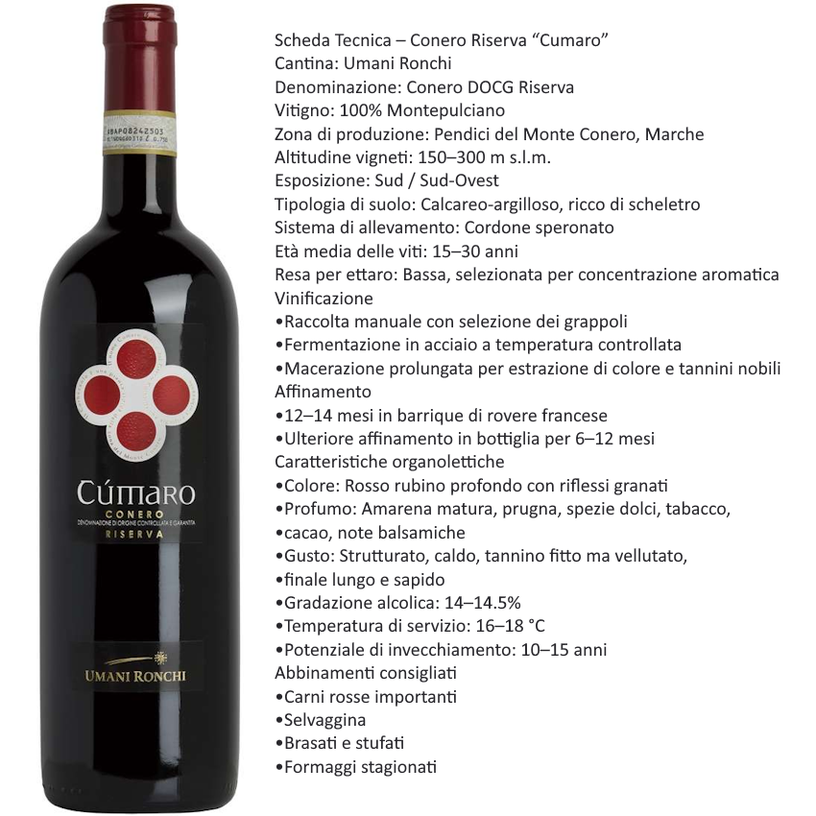 Nel cuore delle Marche, dove il mare incontra la roccia bianca del Conero, nasce Cumaro, la Riserva che incarna l’anima più profonda del Montepulciano. Un vino che racconta la storia di un territorio unico, modellato dal vento marino e dal sole del Sud. Cumaro è il frutto di una selezione rigorosa delle migliori uve Montepulciano coltivate sulle pendici del Monte Conero. Qui, la natura offre un microclima irripetibile: brezze marine, escursioni termiche e suoli calcareo-argillosi che donano al vino struttura, freschezza e longevità. Profumi intensi di frutta scura e spezie, Trama tannica elegante e avvolgente, Sorso pieno, armonico, persistente, Un equilibrio perfetto tra potenza e finezza. Cumaro è un vino da meditazione, ma anche un compagno ideale per piatti ricchi e saporiti. Ogni sorso è un viaggio nel carattere autentico del Conero. Il passaggio in barrique di rovere francese esalta la complessità del vino senza sovrastarlo. Il tempo in bottiglia completa l’opera, regalando un bouquet ampio e una struttura vellutata. Perfetto per degustazioni, eventi, ristorazione di alto livello e collezionisti