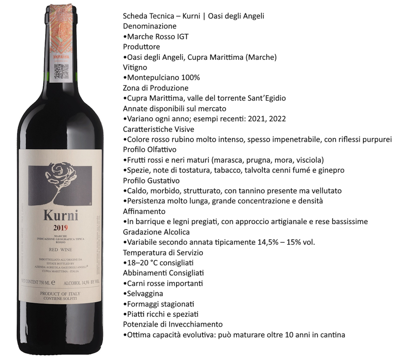 Nel cuore delle Marche, a Cupra Marittima, sorge l'Oasi degli Angeli, una cantina divenuta simbolo di eccellenza e visione. In questo luogo sospeso tra mare e collina, Eleonora Rossi e Marco Casolanetti hanno dato vita a un progetto radicale, dove la natura guida e l'uomo ascolta. Da questa filosofia nasce il Kurni, un vino che ha rivoluzionato la percezione del Montepulciano e che, fin dal suo debutto nel 1997, è considerato un'icona dell'enologia italiana. Il Kurni è un rosso potente, sensuale e profondissimo, frutto di rese bassissime, selezioni maniacali e un lavoro in vigna quasi scultoreo. Ottenuto da Montepulciano in purezza e classificato come Marche Rosso IGT, è prodotto in quantità estremamente limitato e affinato in legni pregiati con tempi lenti e cura artigianale. Alla vista si presenta con un colore rubino impenetrabile, dai riflessi violacei che raccontano concentrazione e gioventù. Al naso esplode in un ventaglio di frutti neri maturi, amarena, mora e prugna, accompagnati da cacao, tabacco dolce, spezie orientali, balsamicità e un tocco di incenso. Al palato è avvolgente, opulento e vellutato, con un tannino setoso e una struttura monumentale che conduce ad una persistenza lunghissima. È un vino che non si dimentica. Si abbina magnificamente a carni rosse importanti, selvaggina, formaggi stagionati e piatti ricchi e speziati, ma soprattutto ai momenti speciali. Il Kurni ama il tempo: può riposare in cantina per molti anni, evolvendo verso sfumature ancora più complesse e affascinanti.