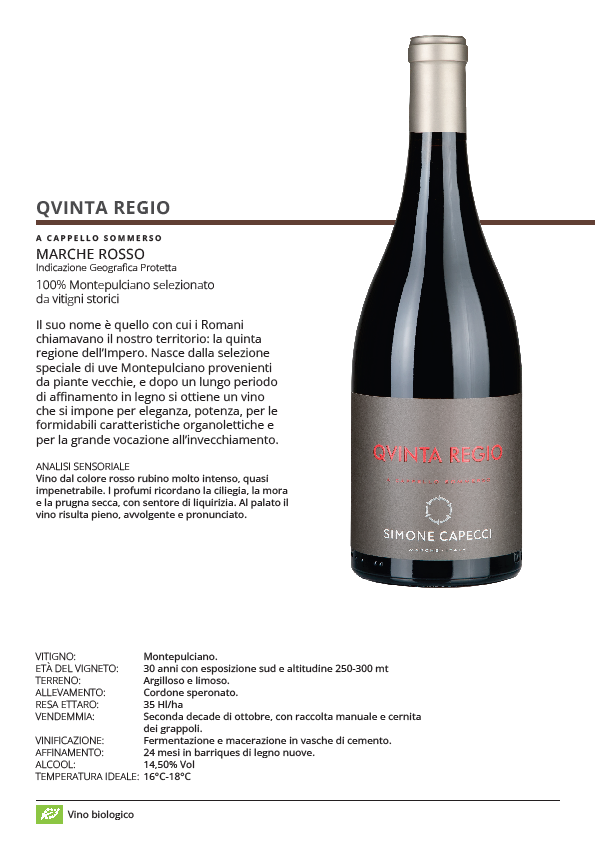 Qvinta Reggio nasce nel silenzio operoso delle colline marchigiane, dove il tempo segue ancora il ritmo della natura e ogni gesto è guidato dal rispetto per la terra. È l'espressione più autentica della visione di Simone Capecci, un Montepulciano che interpreta il territorio con rigore, profondità ed eleganza, senza mai rinunciare alla sua anima autentica. Nel calice si presenta con un rosso rubino intenso e compatto, preludio di una struttura solida e misurata. Il profilo aromatico è profondo e avvolgente, con note di frutta rossa maturazione, amarena e prugna, arricchite da spezie fini e lievi accenni balsamici che si fondono con naturale armonia. Al palato è pieno, coerente e