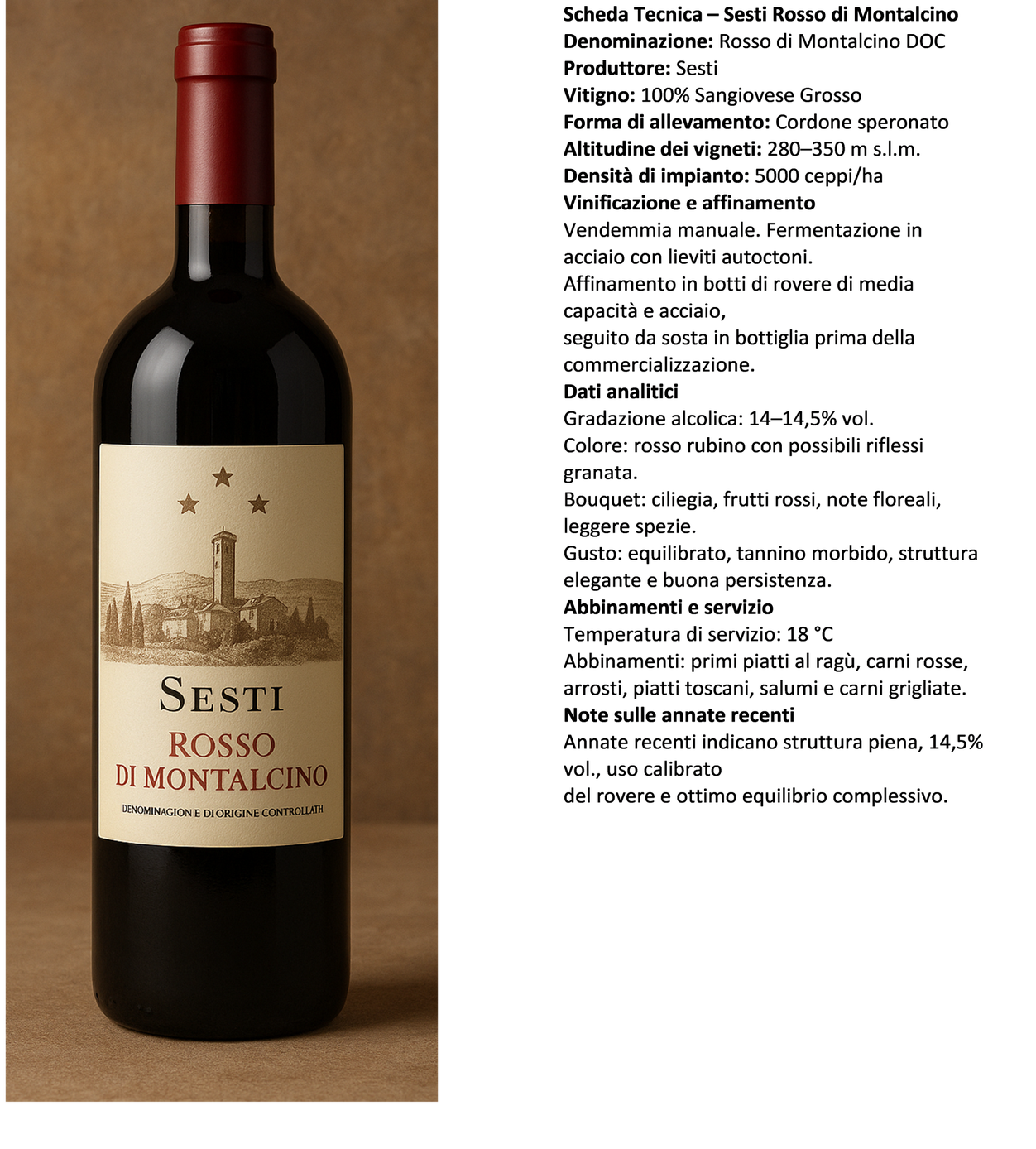 profumi di ciliegia maturazione, erbe mediterranee e spezie sottili si integrano a una struttura setosa, sostenuta da tannini eleganti e da una freschezza viva. Il finale, lungo e persistente, conferma la vocazione del vino alla longevità. Raffinato, complesso e profondamente territoriale, il Brunello Sesti è ideale per accompagnare carni rosse, selvaggina e formaggi stagionati, offrendo nel calice
