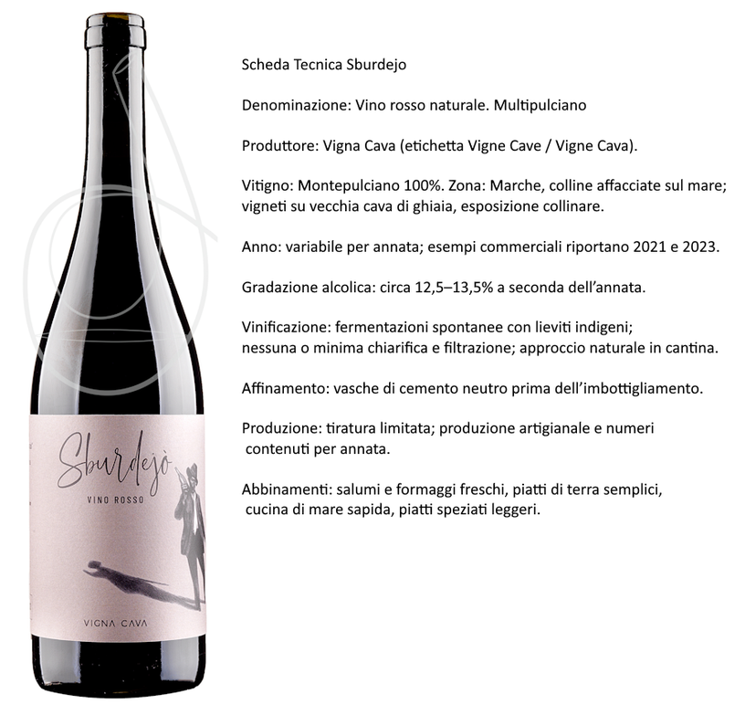 Sburdejo di Vigna Cava è un vino naturale rosso, 100% Montepulciano, vinificato spontaneamente e affinato in cemento; produzione limitata e carattere territoriale deciso, ideale per chi cerca freschezza, sapidità, autenticità,  bassa solforosa, vinificazione naturale, forte senso del luogo.
