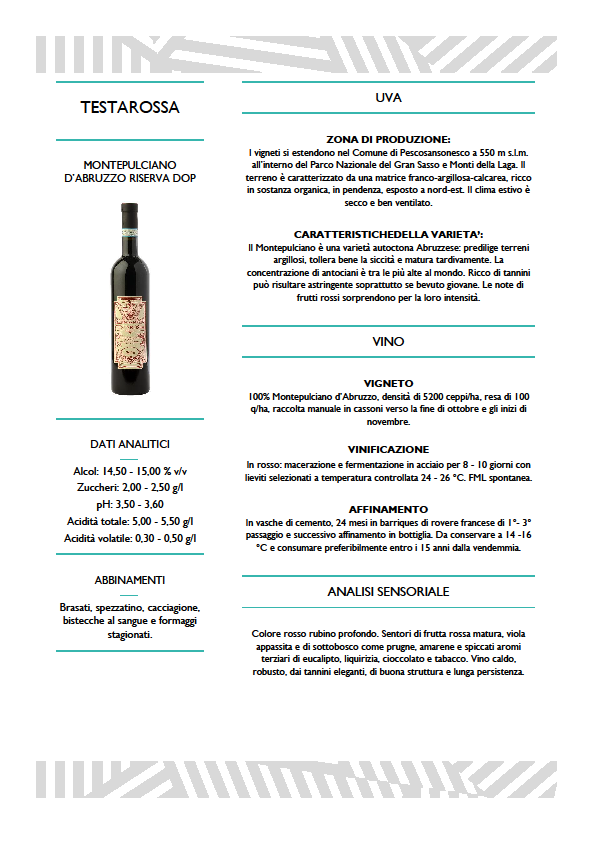 Tutto inizia a Pescosansonesco, dove la vigna cresce a un'altitudine di circa 550 metri, protetta dalle pareti rocciose del Gran Sasso. Il suolo è un mosaico di argilla e calcare, capace di nutrire le radici con una mineralità profonda, mentre le forti escursioni termiche tra il giorno e la notte fissano nei grappoli profumi eleganti e un'acidità vibrante, segreto della longevità di questa Riserva. La vendemmia non segue il calendario, ma il ritmo della maturazione: i grappoli di Montepulciano vengono raccolti manualmente solo tra la fine di ottobre e i primi giorni di novembre, quando sono carichi di sostanze estrattive. In cantina, la vinificazione avviene in acciaio con una macerazione sulle bucce di circa 15-20 giorni, utilizzando lieviti selezionati per preservare l'identità del vitigno. Il Testarossa è un vino che non ha fretta. Dopo la fermentazione, il mosto viene trasferito in barrique di rovere francese nuove, dove riposa per un periodo che va dai 16 ai 18 mesi. Questo passaggio non serve a coprire il vino, ma a rifinirne i tannini, rendendoli vellutati e pronti per l'ultimo grande passo: 6 mesi di affinamento in bottiglia, necessari per armonizzare la potenza dell'alcol (che raggiunge i 14,5-15% vol) con la finezza del frutto.