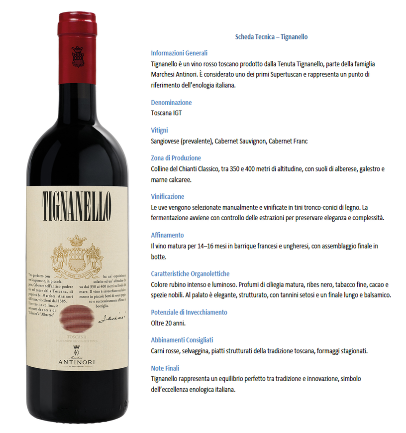 setosa, una struttura imponente ma perfettamente armonica, tannini cesellati e una progressione che si distende in un finale lungo, balsamico e minerale. La filosofia produttiva che guida il Tignanello e fondata sulla precisione: selezione clonale, microvinificazioni per parcella, sostenibilita in vigna e un approccio che privilegia la purezza espressiva del Sangiovese, arricchita dall'eleganza del Cabernet Sauvignon e dalla profondita del Cabernet Franc.  Una bottiglia capace di trasformare ogni momento in un'esperienza memorabile.